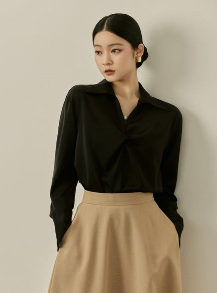 黑色,经典而永恒,是正肩衬衣的灵魂佳选。品牌采用简洁流畅的剪裁,正肩廓形柔和不生硬,以版型的简洁,展现稳重与干练。黑色的基调,显瘦且易于搭配,与搭配高腰裤搭配,大方得体。裤子棕色的基调,面料纹理展现简约自然,智慧中透露着时尚。