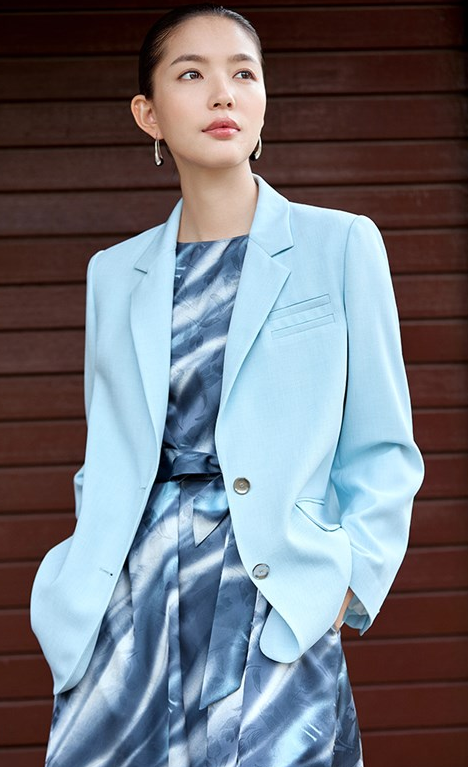 浅青色的正肩西服,撷取春日里的一抹新绿,为都市的喧嚣带来清新与宁静。剪裁利落、线条流畅,正肩设计更是将女性的身形勾勒得挺拔而优雅。选用高质羊毛混纺,保持了良好的透气性,又赋予了衣物良好的保暖性能。浅青色调清新淡雅,适合职场上的干练女性,也能轻松驾驭休闲场合。